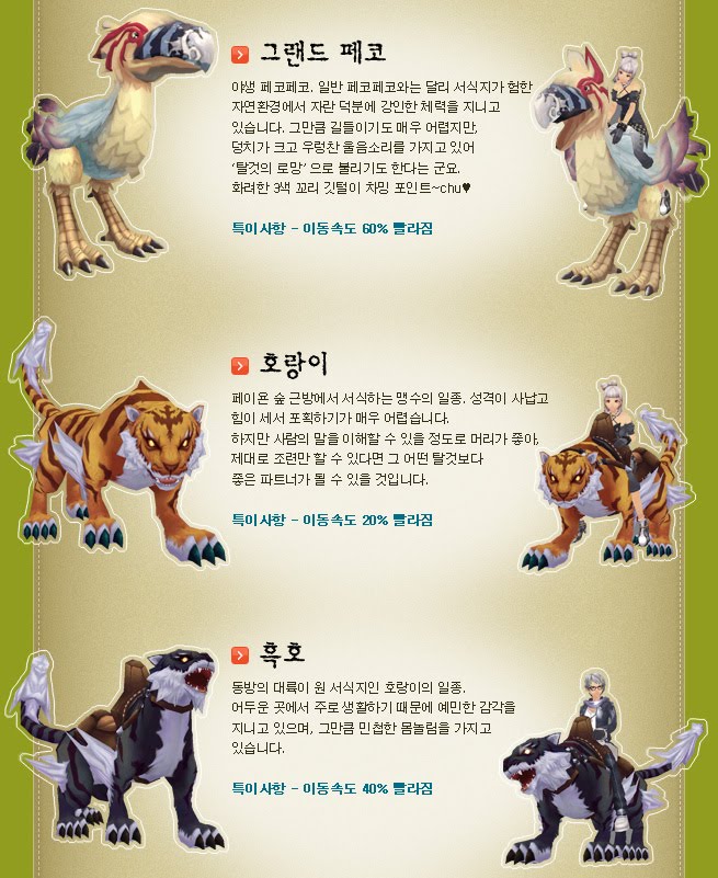 Well, the mounts do not do much for now except providing players with additional speed, which you can see by the xx% from the pictures below. I am lazy to translate the names and descriptions :p