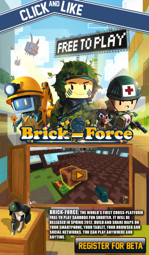 A cross between Minecraft and Special Force (an online shooter), Brick Force brings out the best of both worlds in this wacky and fun looking title. Oh, by the way, Closed Beta sign up for the English server is up right now! The link is @ http://www.brick-force.com/en/registration. Click on the image below to access the Facebook page!